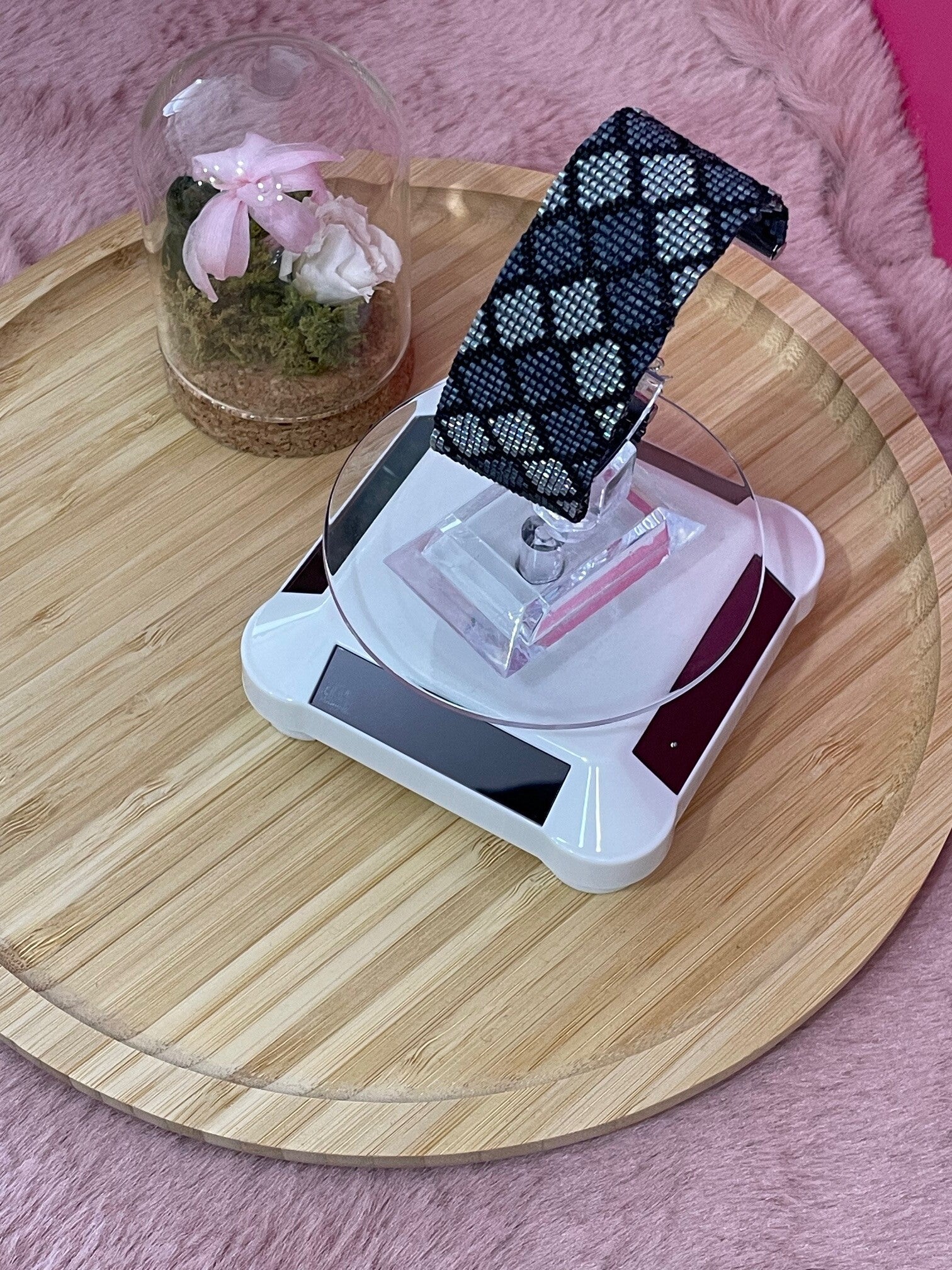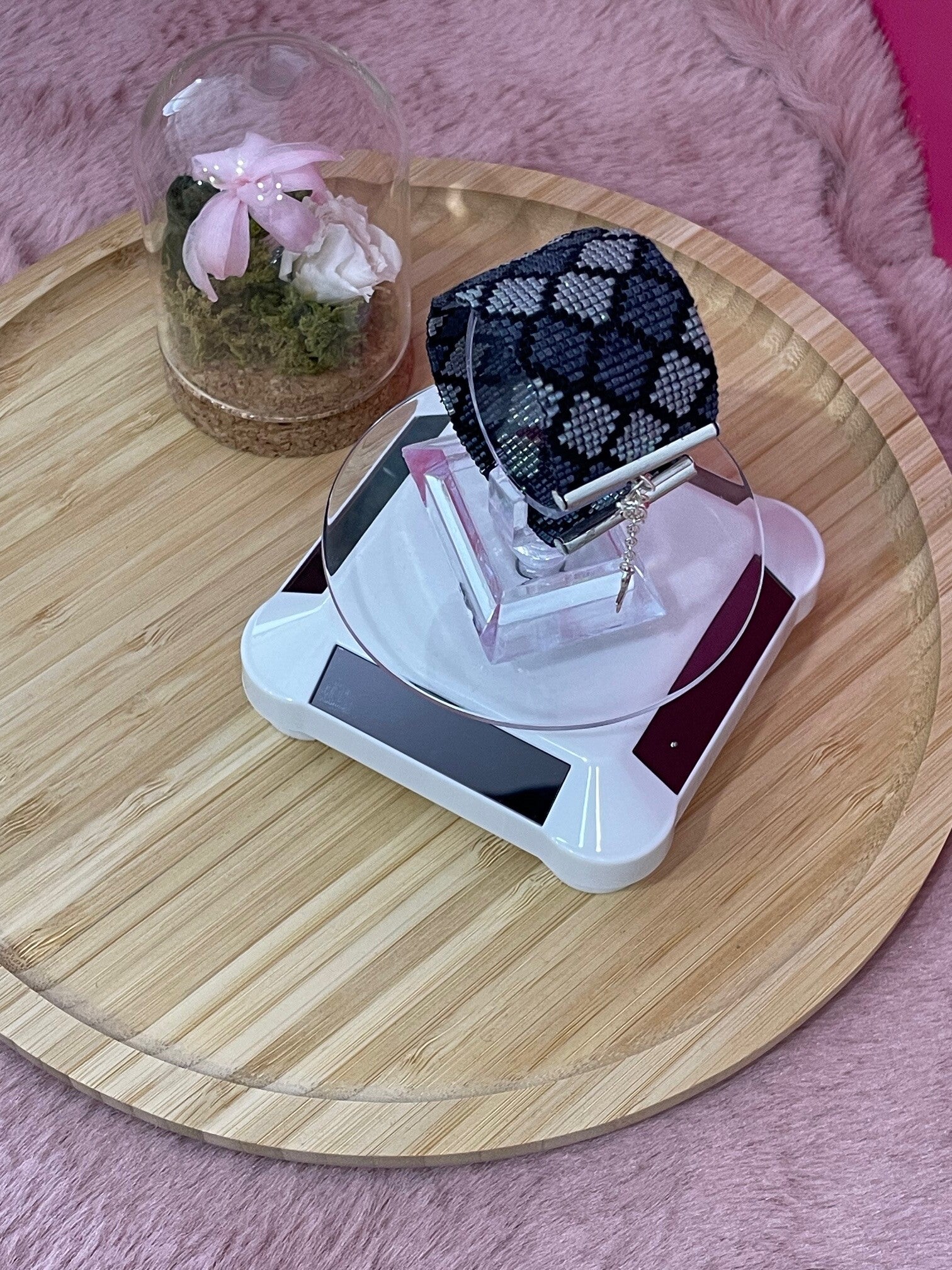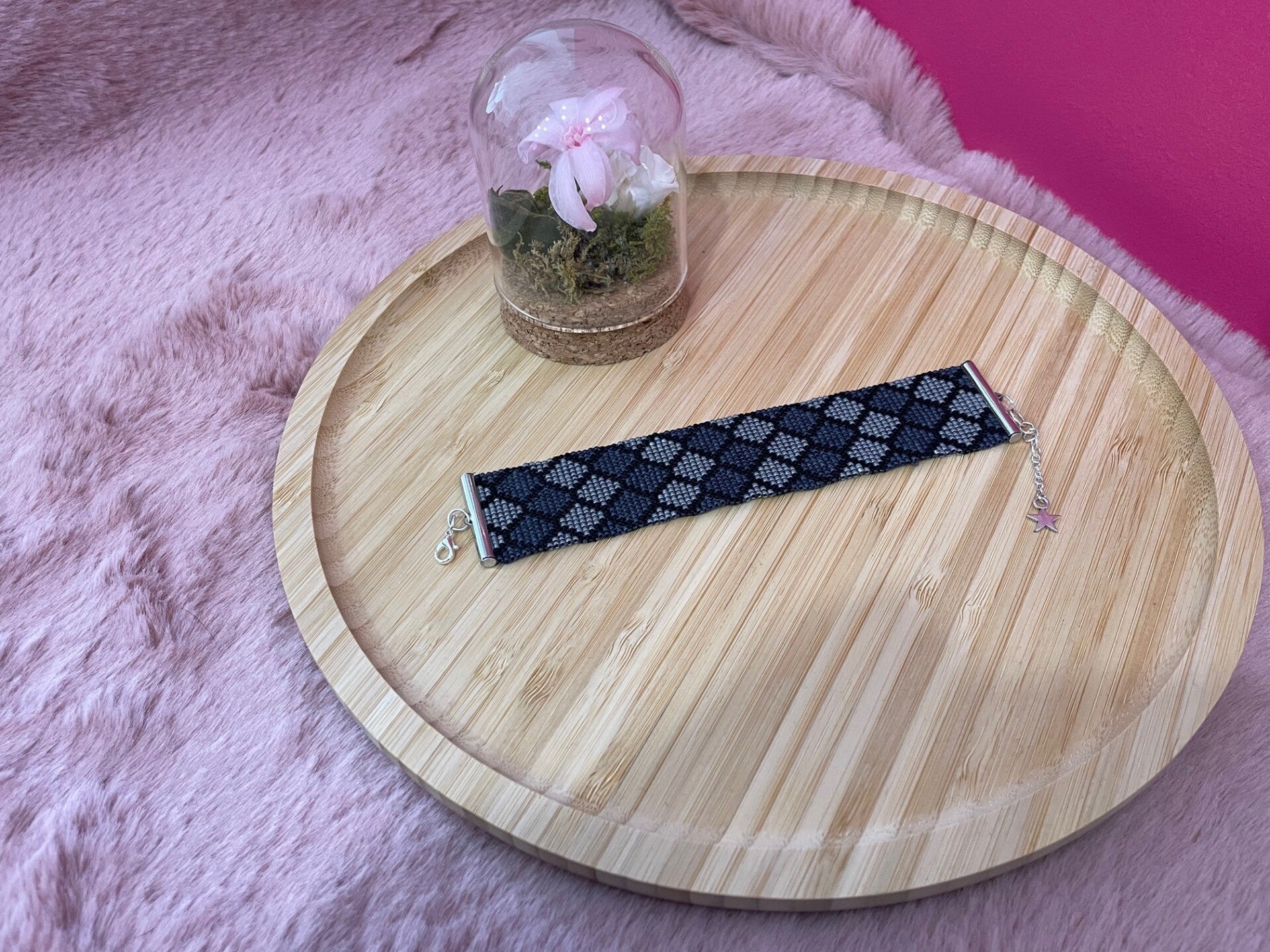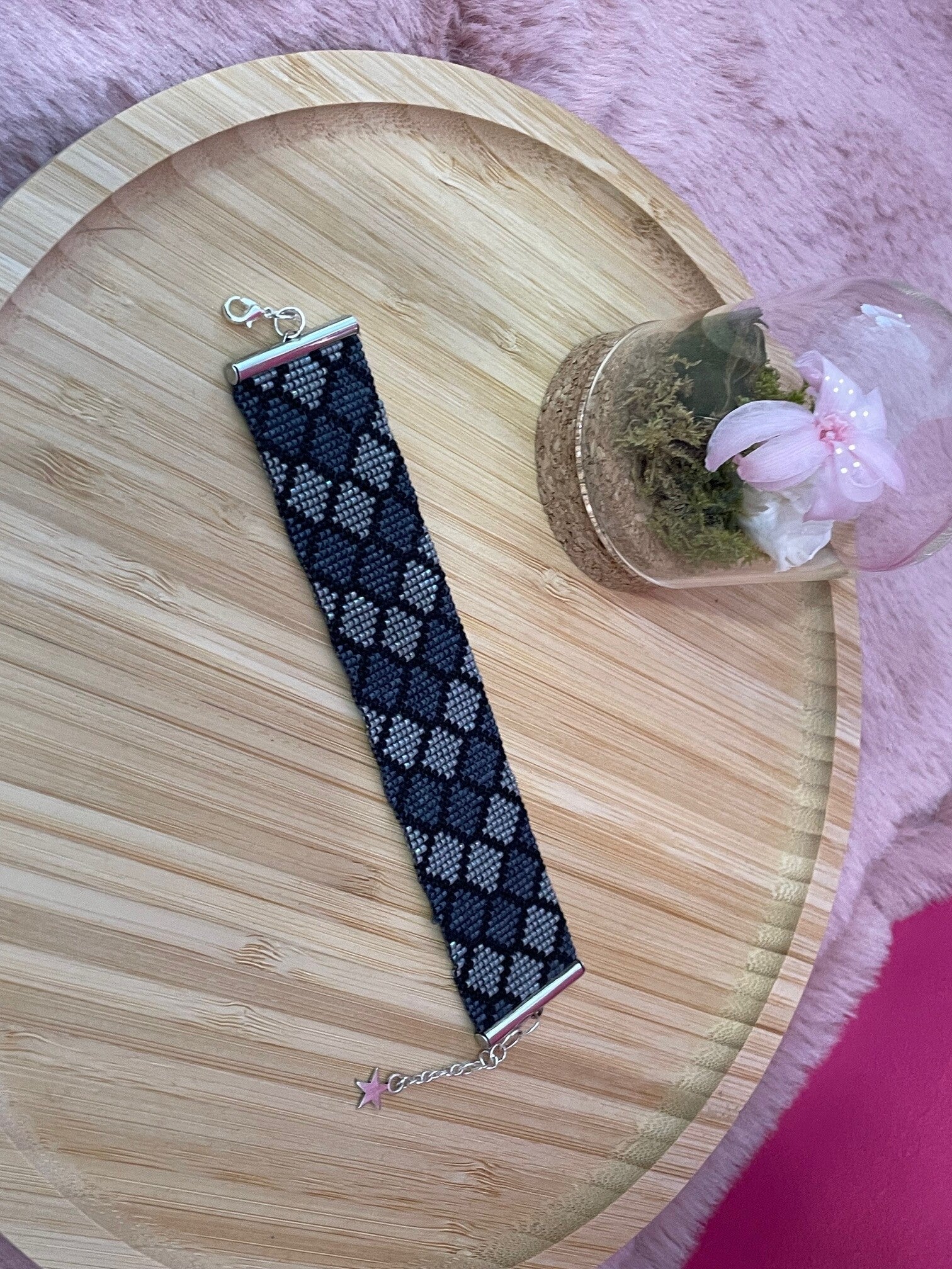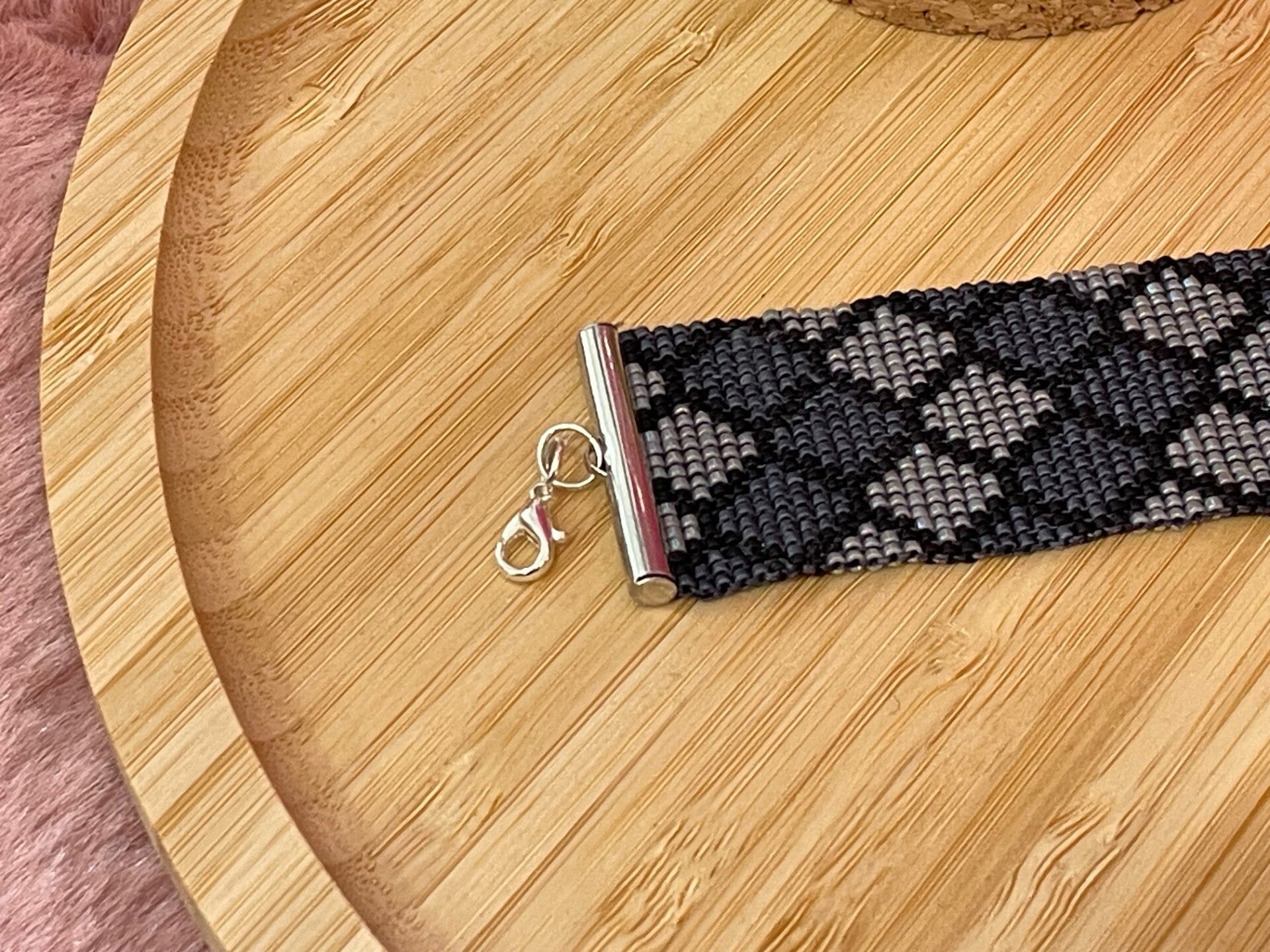 Ce bracelet manchette raffiné est entièrement réalisé à l’aiguille avec des perles japonaises Miyuki, reconnues pour leur régularité et leur éclat. Il arbore un motif géométrique élégant composé de losanges en nuances de noir, gris et argent, créant un effet visuel sophistiqué et moderne.